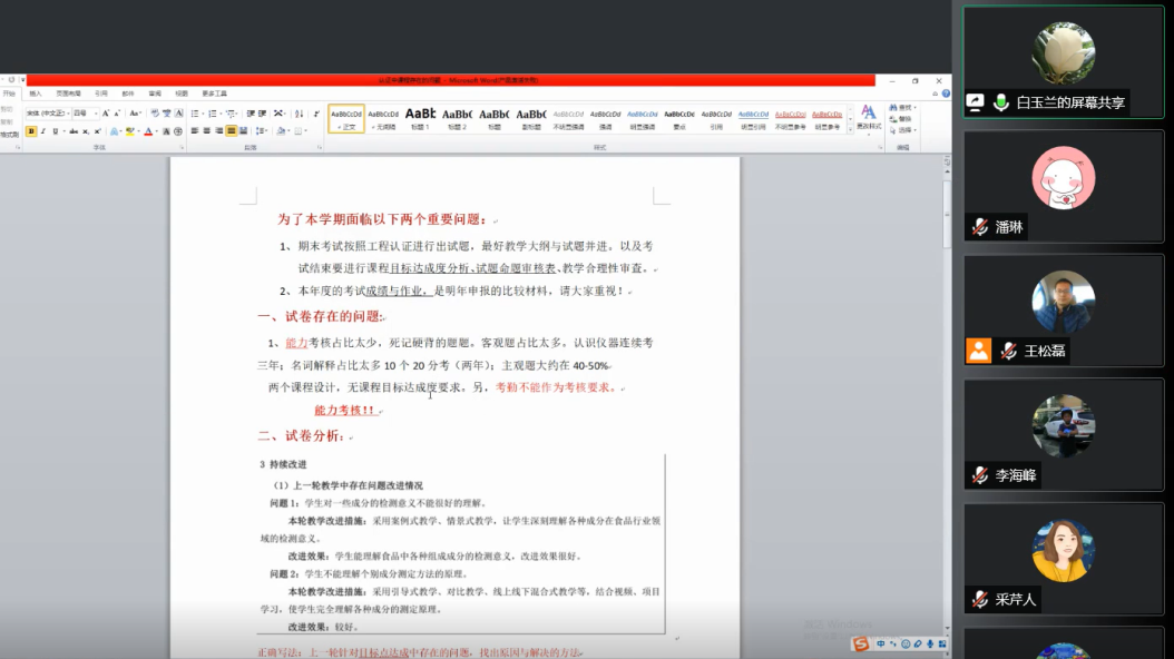 第三部分,张惠玲老师针对本学期末的课程考试提出考核内容必须满足工程认证的要求,指出前期工程认证申请中试题与产出指标点的对应、课程目标达成情况分析等存在的问题,通过举例子讲解如何理解毕业要求指标与课程目标的对应关系,提出多元化教学方式内容一定要支撑试卷能力考核要求,加强学生分析设计能力培养,且考核内容必须与课程目标对应一致。最后要求党员教师要认真学习工程认证内容要求,推进工程认证工作持续进行,争取早日通过专业认证,更好的实现为国家培养优秀的食品专业人才。