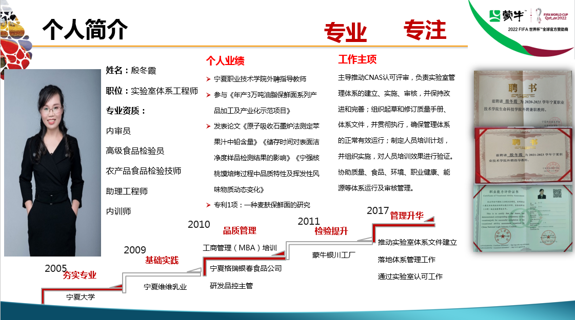 殷冬霞老师是蒙牛特仑苏(银川)乳业有限公司的实验室体系工程师,具有内审员、高级食品检验员、农产品食品检验技师、内训师等职业资格证书,有着丰富的企业质量管理、内审和员工培训经验,也是我们成人漫画