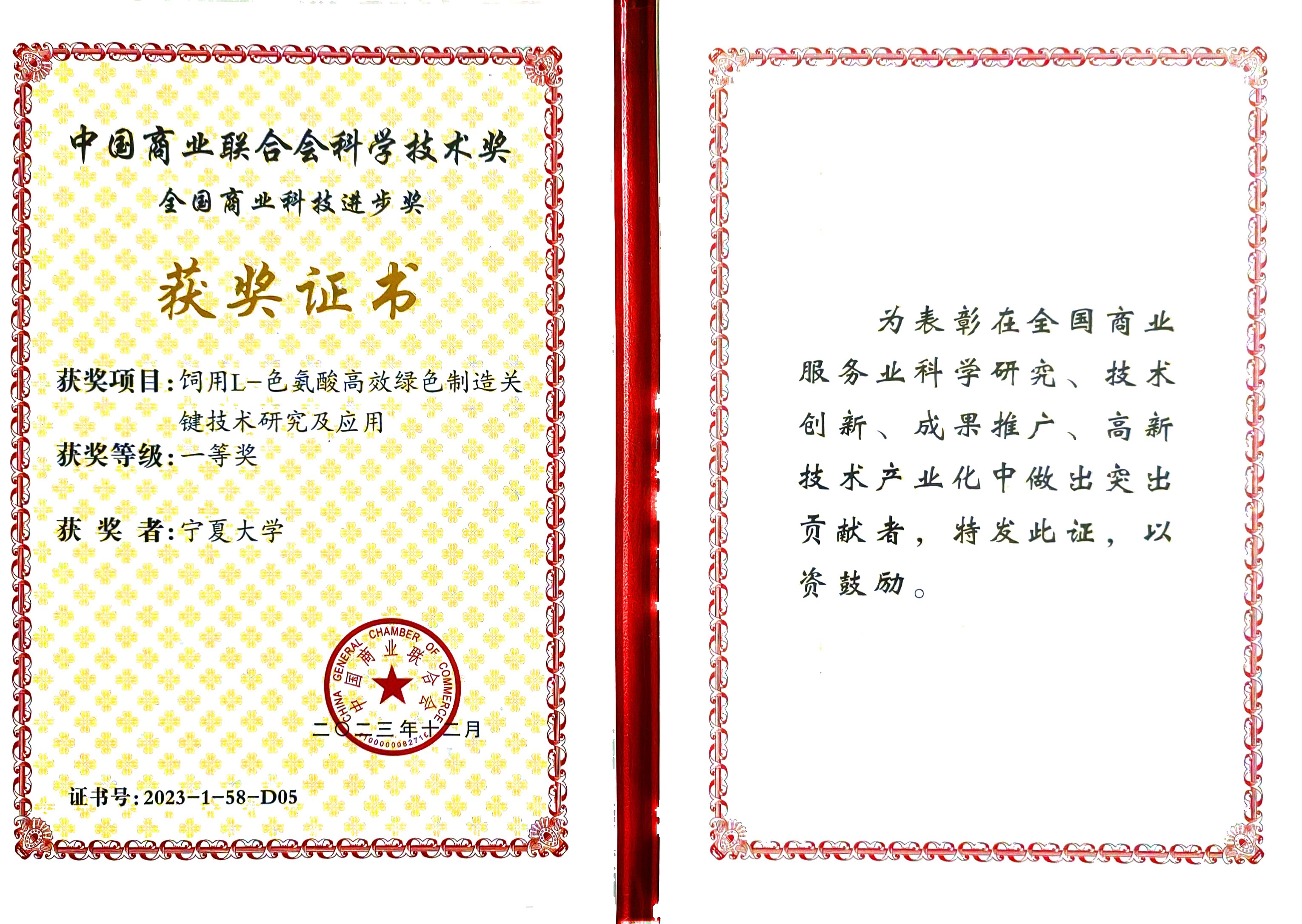 由成人漫画 健康食品生物制造研究团队方海田教授、刘慧燕副教授和魏晓博博士参与完成的成果“饲用L-色氨酸高效绿色制造关键技术研究及应用”获得了中国商业联合会2023年度全国商业科技进步奖一等奖。