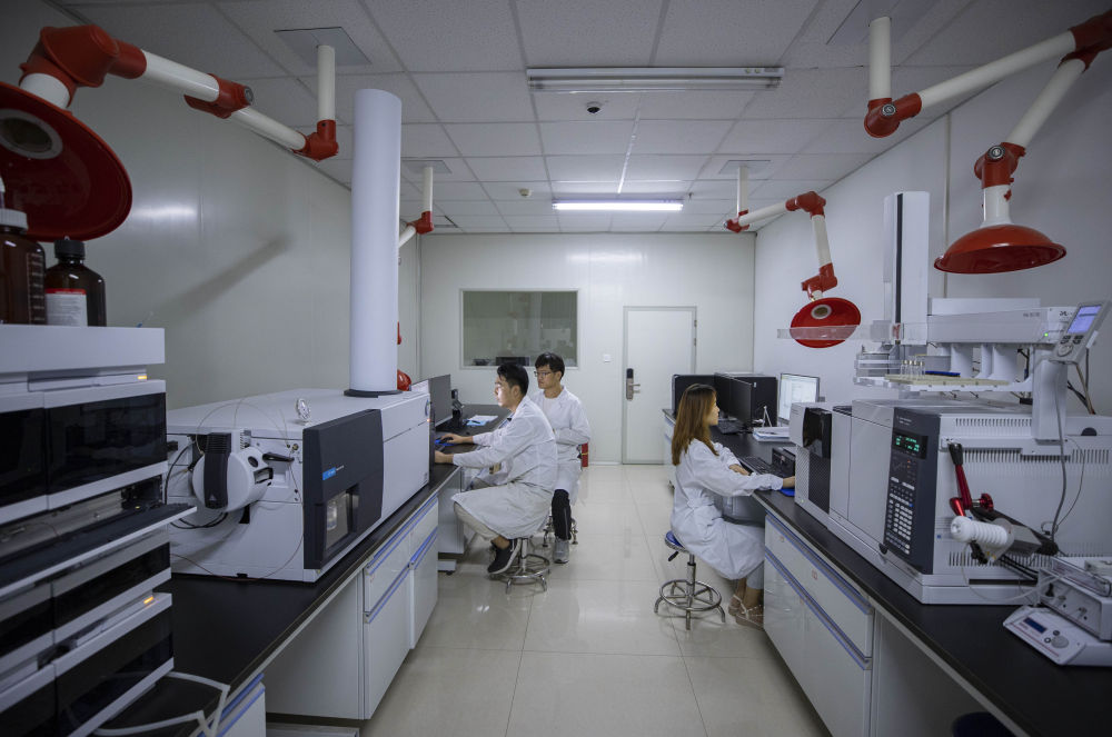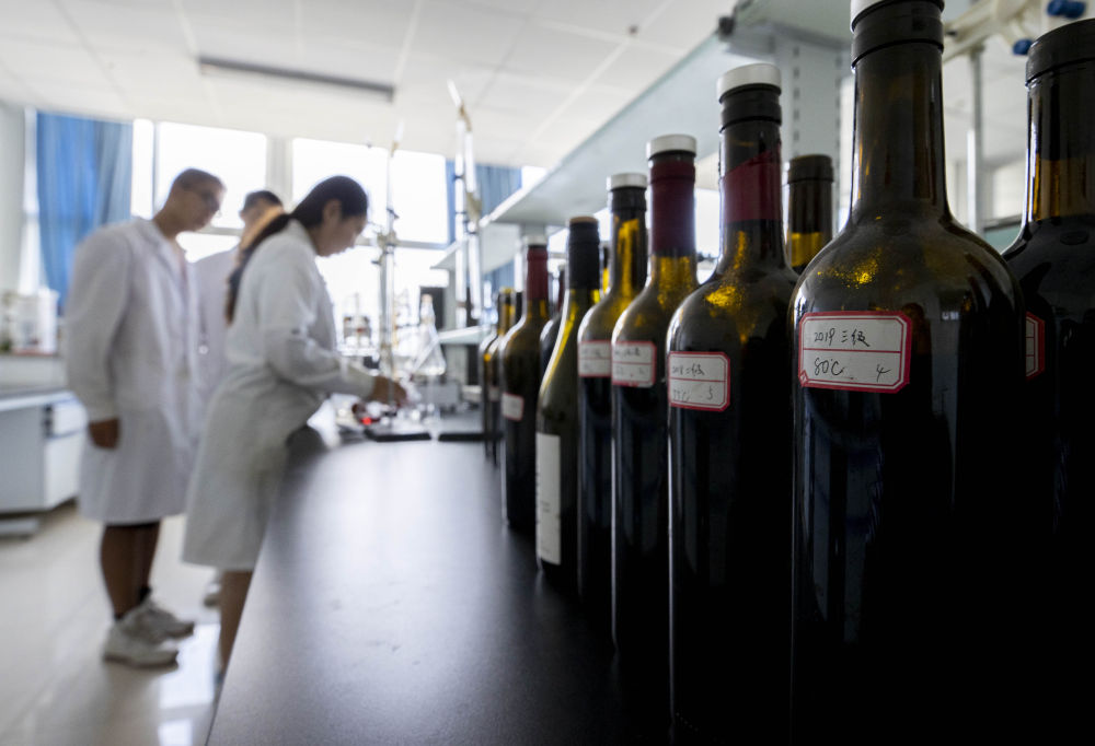 食品与葡萄酒学院葡萄系的葡萄与葡萄酒质量分析实验室内,研究生在进行葡萄酒化学物质分析(7月8日摄)。