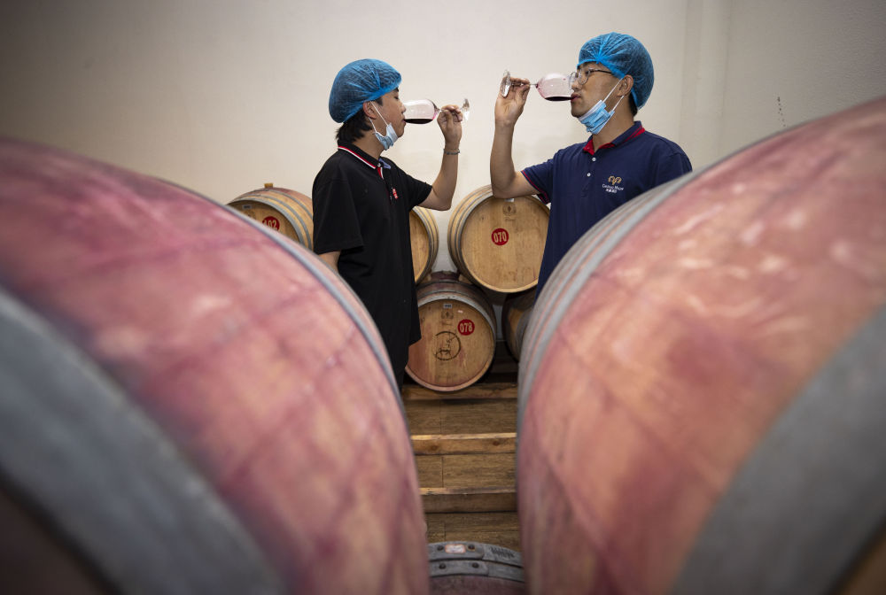 食品与葡萄酒学院葡萄系的学生一同品尝葡萄酒(7月8日摄)。
