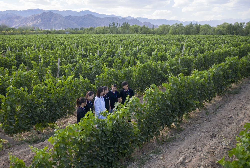 食品与葡萄酒学院的教师(左三)为学生讲解葡萄栽培知识(无人机照片,7月8日摄)。