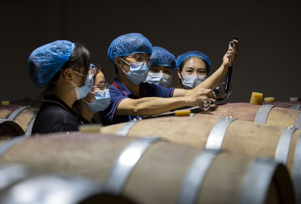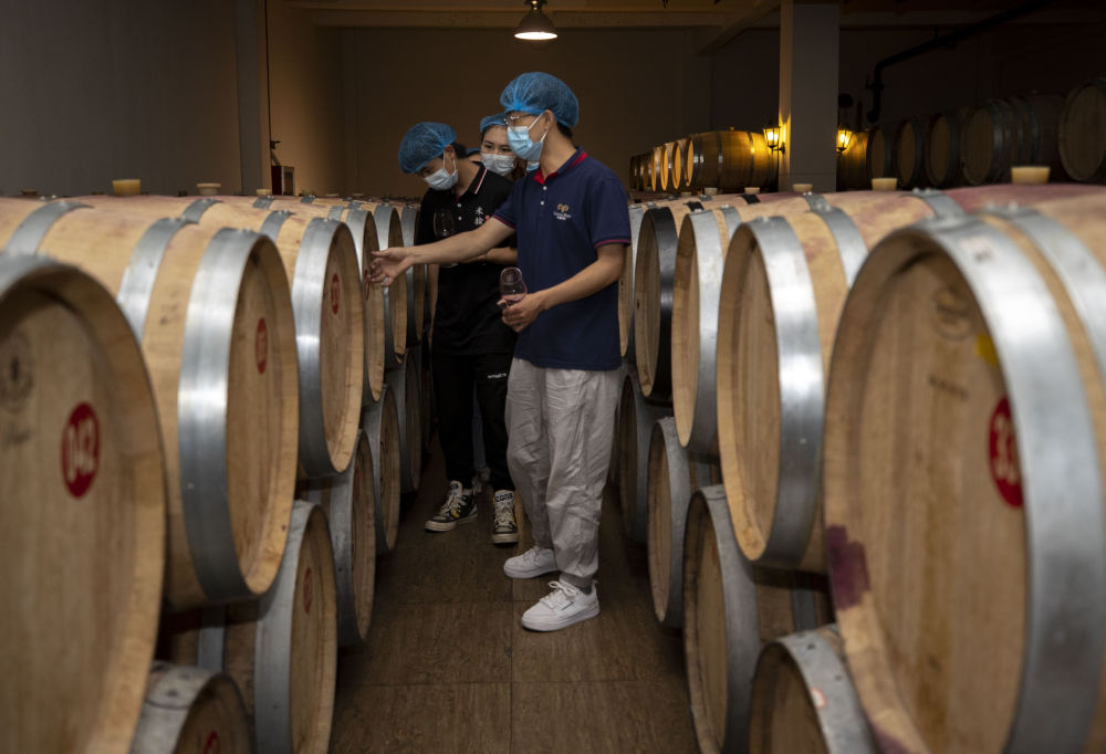 在位于宁夏贺兰山东麓的一酒庄的橡木桶陈酿区,酒庄工作人员(左三)在向成人漫画