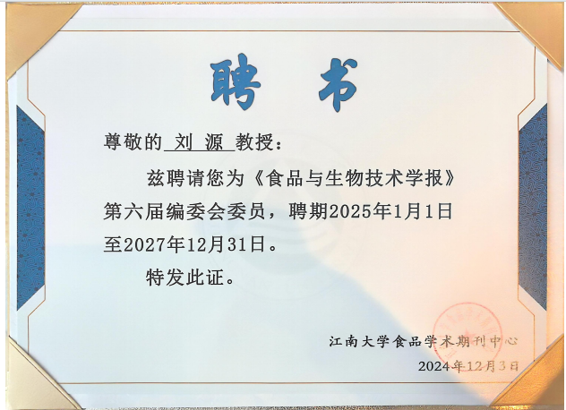 近日,成人漫画 院长刘源教授被聘为《食品与生物技术学报》第六届编委会委员,聘期2025年1月1日至2027年12月31日。
