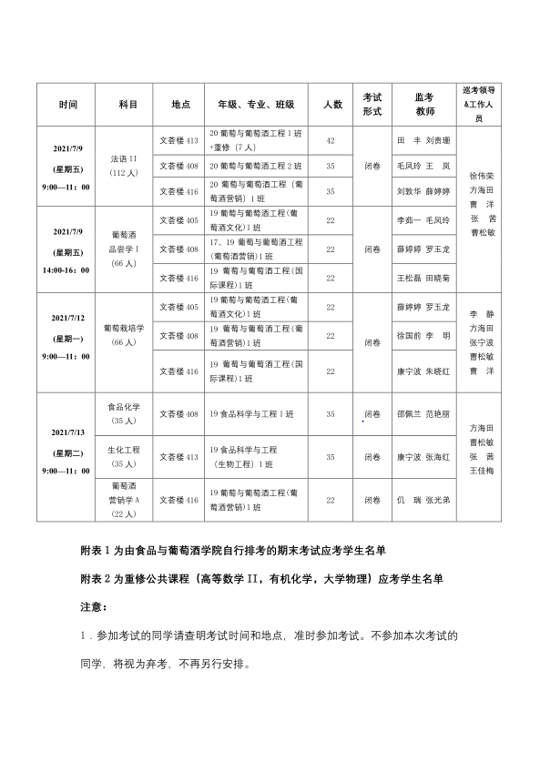 食品与葡萄酒学院2020-2021学年第二学期期末考试安排